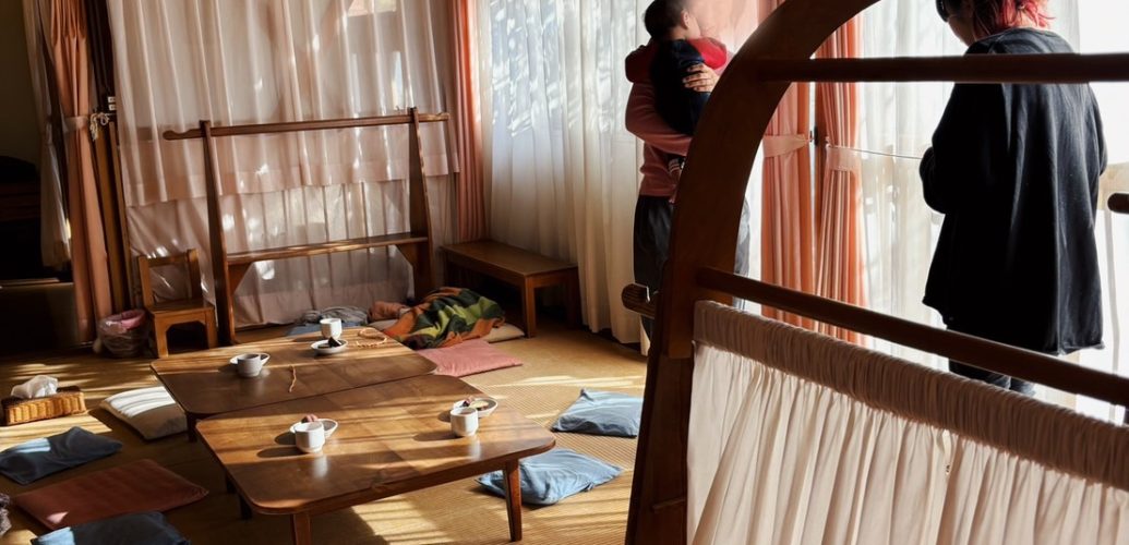 素朴なおもちゃで遊ぶ姿を見守りながら、手を動かす。こどもの園のひとときを共に過ごしませんか?在園保護者がお待ちしています。